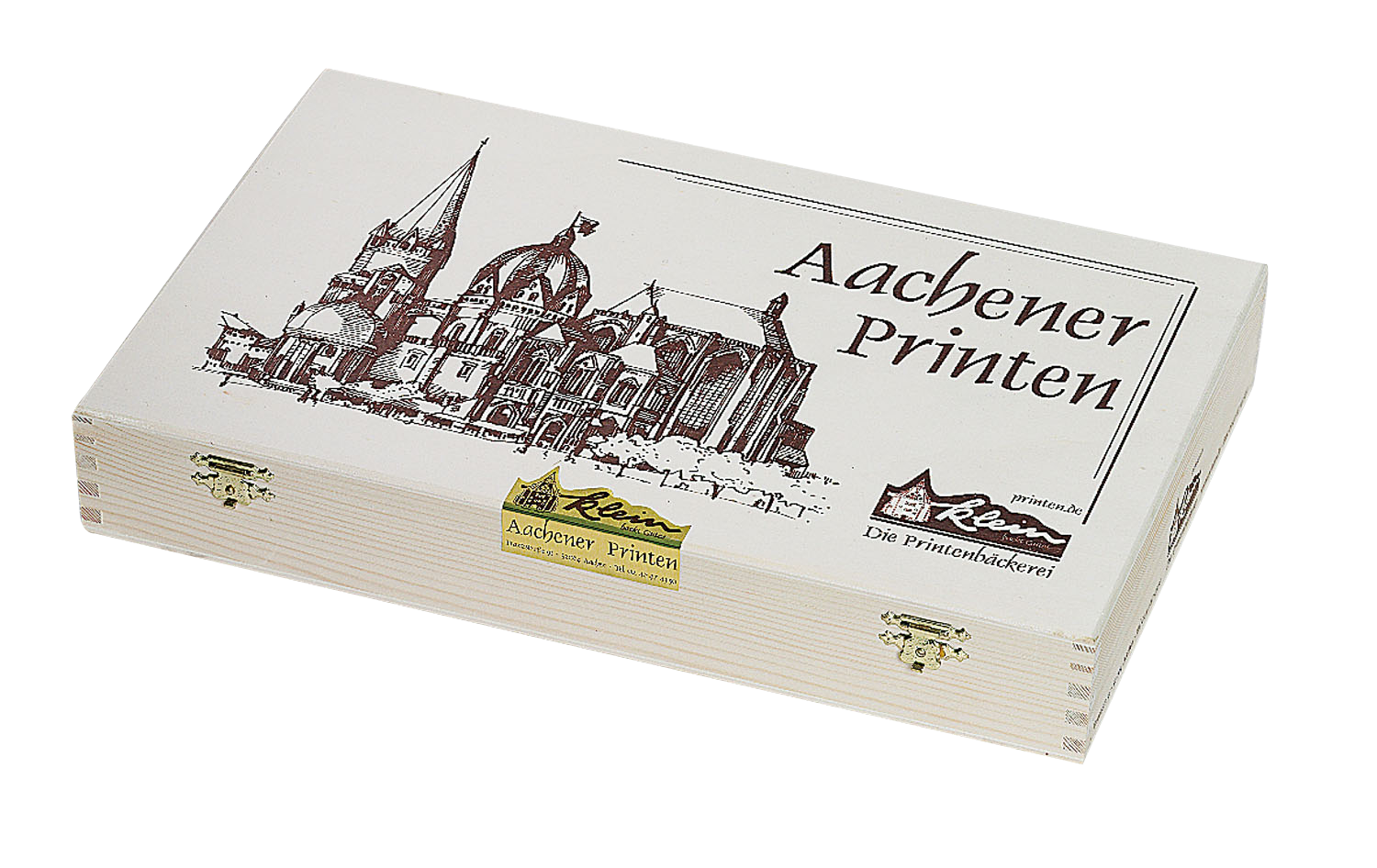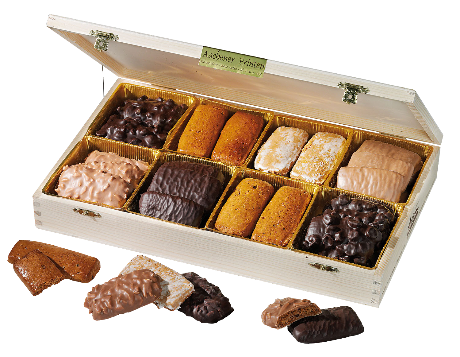 Sechs verschiedene Printen teilweise mit Zuckerguss, Vollmilch- oder Zartbitterschokolade überzogen aus der Kultbäckerei im Herzen Aachens. Das Rezept dieses handwerklichen Gebäcks wird in der 4. Generation des Familienunternehmens Klein als Geheimnis gehütet. Handgefertigt und fachmännisch gebacken, verpackt in einer edlen Holzkiste mit Scharnieren aus der traditionellen Backstube der Aachener Printenbäckerei.