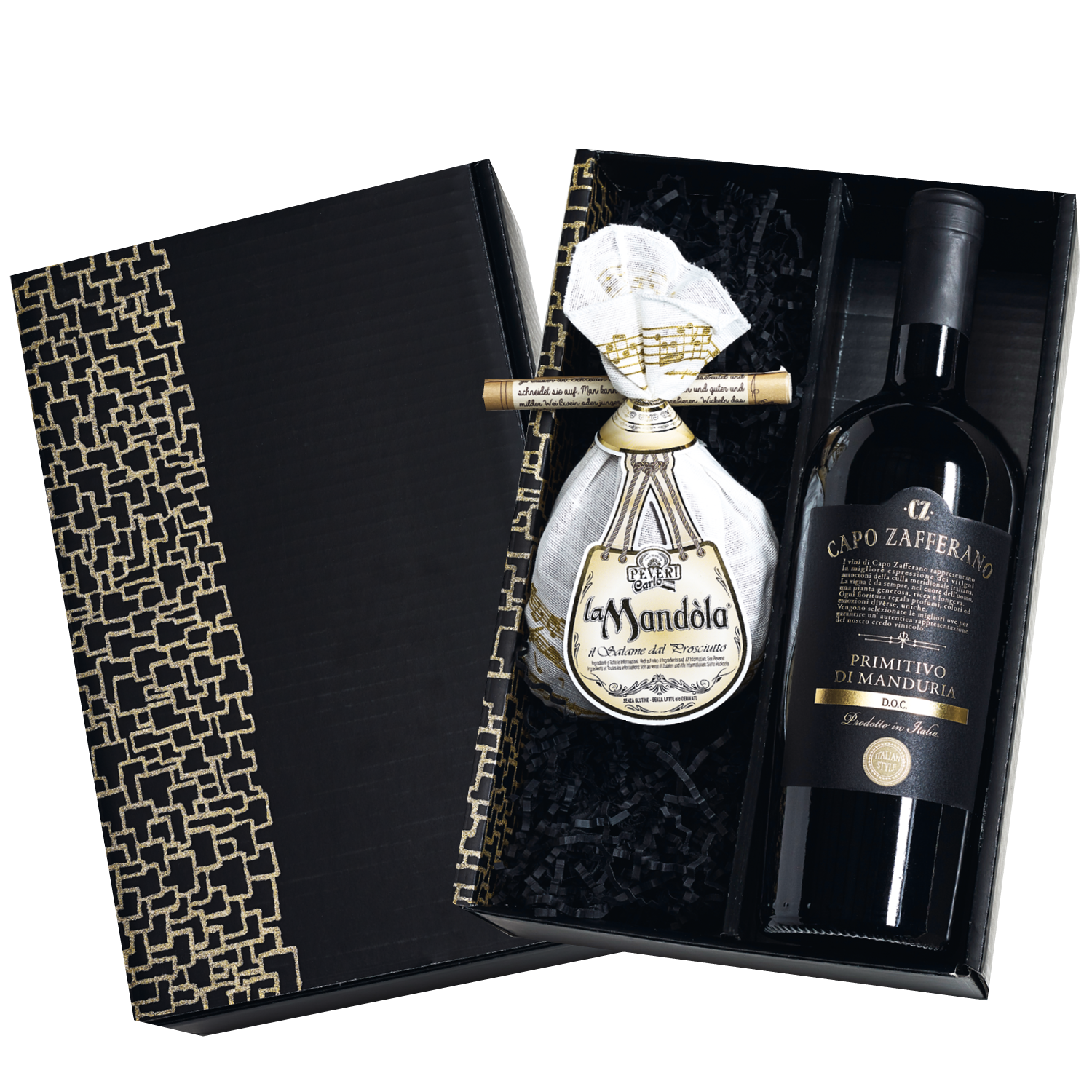 | Inhaltsstoffe / Allergene: | "La Mandola" Schweinefleisch, Salz, Gewürze, Aromen, Antioxidationsmittel: Natriumascorbat, Konservierungsstoff: E252 Kaliumnitrat, Konservierungsstoff: E250 Natriumnitrit Capo Zafferano Alkohol 14,5000 Vol.%, Sulfite |