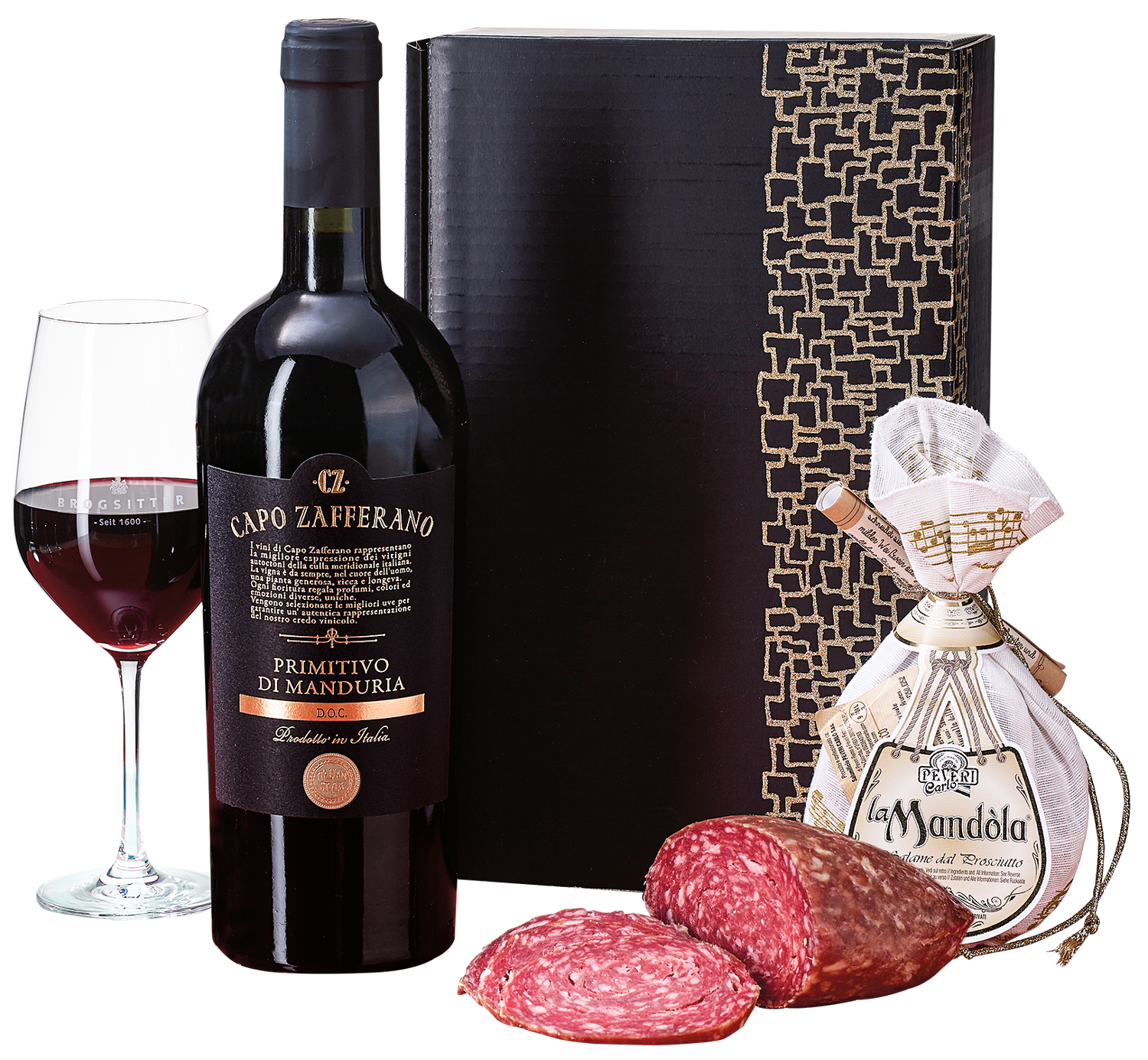 Primitivo ist der Trendrotwein aus Italien. Mit seinem sortentypischen Geschmack bietet der Wein größte Trinkfreude. Er präsentiert sich elegant, ein echter Geheimtipp! Perfekt zu diesem Rotwein passt die „La Mandòla Salame dal Prosciutto“ aus der Familienmetzgerei Peveri. Aus dem mageren Teil des italienischen Schinkens hergestellt und in Rotwein mariniert.
