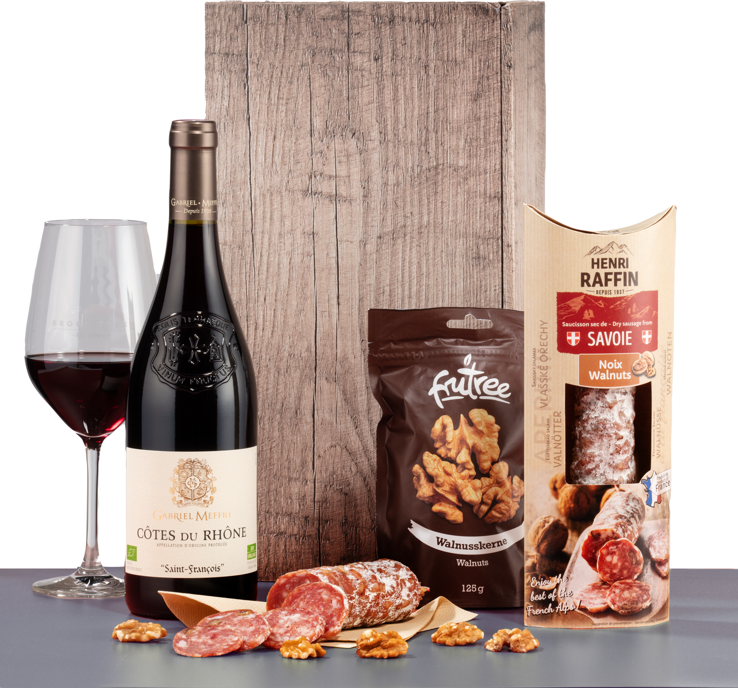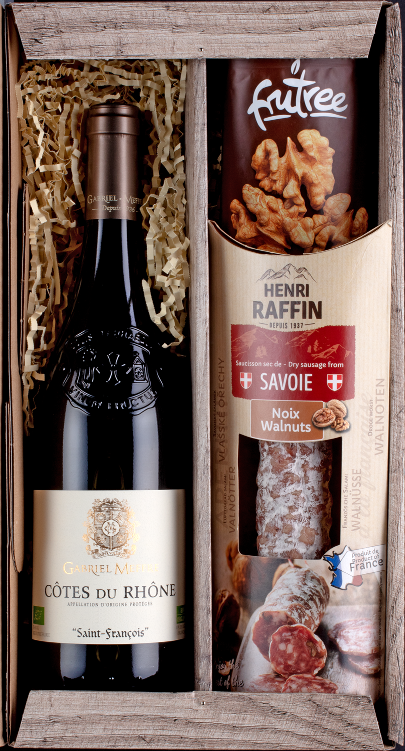 Gabriel Meffre ist eine köstliche Kombination aus Grenache- und Syrah-Trauben gelungen. Angebaut in den Weingärten nach dem Standard des ökologischen Landbaus. Ein fruchtigwürziges Kraftpaket, das hervorragend zur langsam gereiften Walnuss-Salami mit ihrem unvergleichlichen Geschmack und den knackigen Walnüssen passt.